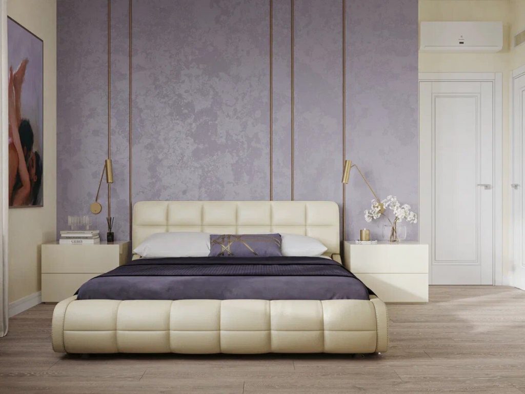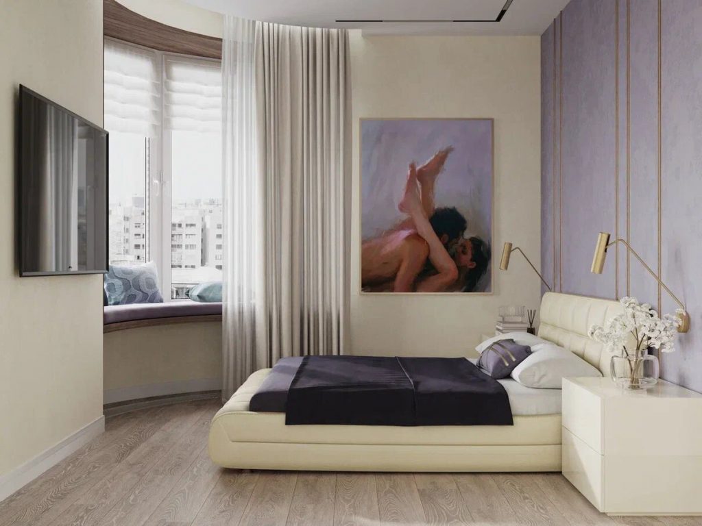 Спальня с огромными окнами получилась светлой и воздушной. Кровать выделяет нежная стена сиреневого цвета, у кровати висит картина современного художника на эротическую тему. В откос закругленного окна встроена подвесная скамья с мягким сиденьем. В спальне имеется зона гардеробной с большим встроенным шкафом и окном.
