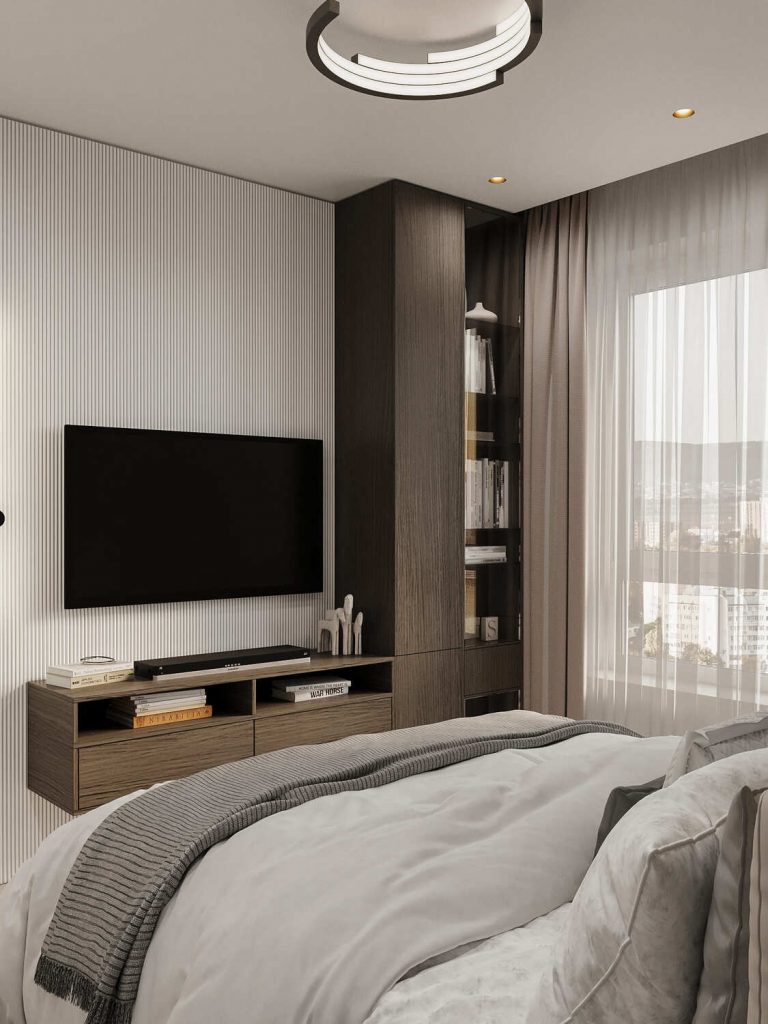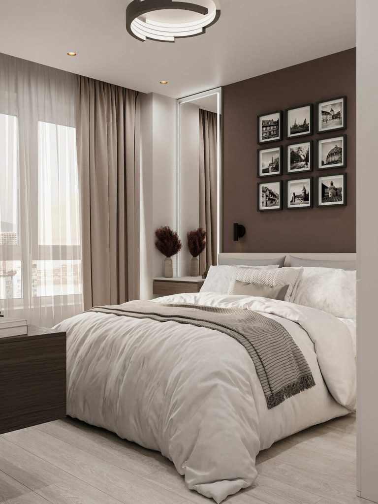 Спальня в этом проекте — это пространство для отдыха, которое сочетает в себе современный стиль и уют. В интерьере использованы спокойные, нейтральные тона, создающие атмосферу гармонии и уюта. Одним из ярких элементов является акцентная стена в глубоких коричневых оттенках, которая добавляет глубины и теплоты помещению, в то время как светло-бежевое постельное белье и мягкие текстуры на кровати создают ощущение уюта и комфорта.