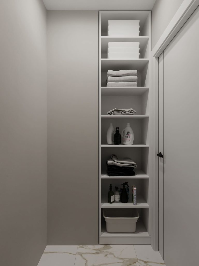 В углу комнаты предусмотрена зона для вешалки, где можно повесить одежду после стирки. Просторные и удобные полки для хранения на различных уровнях позволяют разместить всё необходимое и не перегрузить пространство лишними предметами. Светлые тона и гармоничные материалы, такие как плитка с мраморным рисунком, создают уютную и современную атмосферу в этой функциональной зоне.