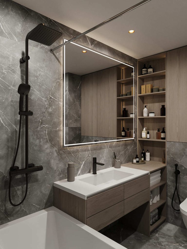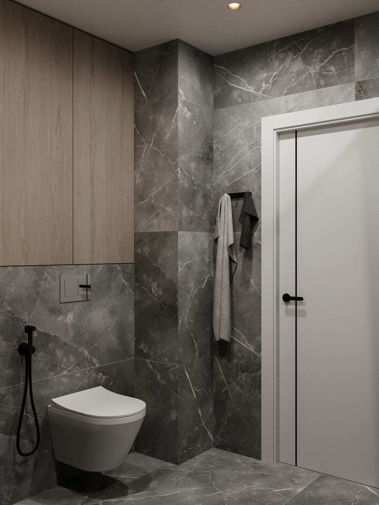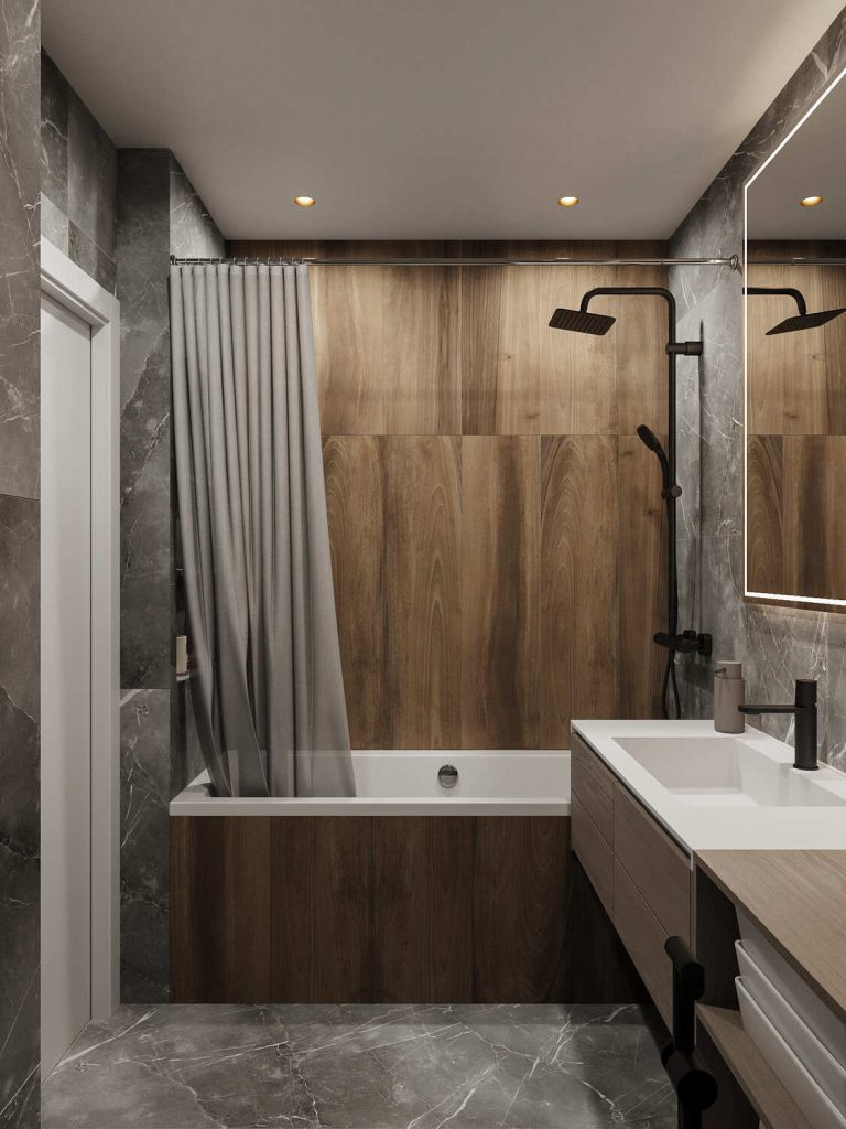 Санузел этого проекта выполнен в современном стиле с использованием контрастных материалов, создающих элегантный и одновременно уютный интерьер. Тёмная плитка с мраморной текстурой, используемая на стенах и полу, создает ощущение роскоши и визуального простора, в то время как деревянные элементы в отделке ванной и под раковиной привносят в пространство тепло и натуральность. Эти материалы идеально комбинируются, чтобы сбалансировать холодность камня и уют древесины, создавая гармоничное пространство для отдыха и восстановления.