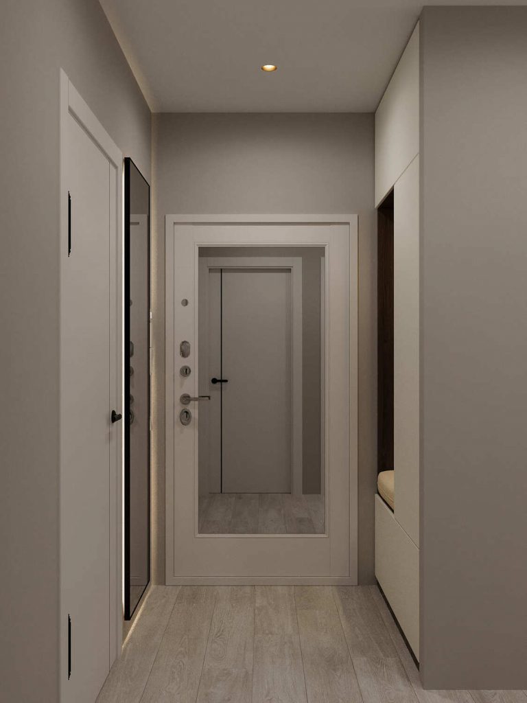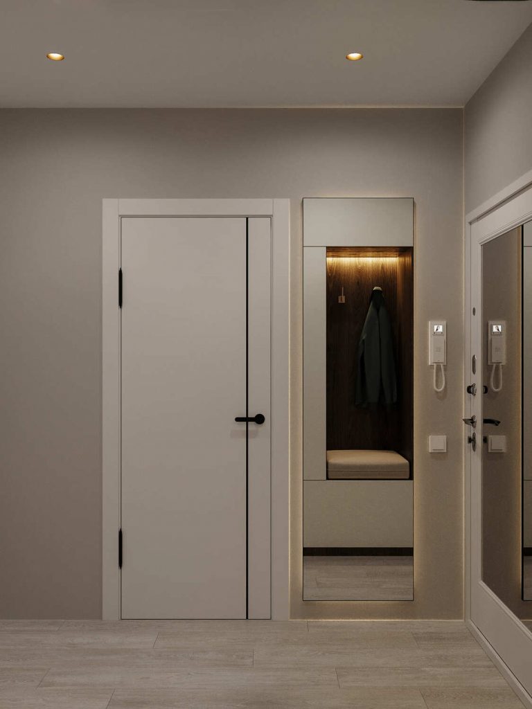 Панели с матовым покрытием на стенах помогают создать элегантную атмосферу, а встроенные светильники идеально дополняют общую картину. Несмотря на компактность, прихожая визуально расширяется за счет зеркала, которое делает пространство более воздушным. Это решение отражает общий стиль квартиры — современный и минималистичный, с акцентом на удобство и практичность.