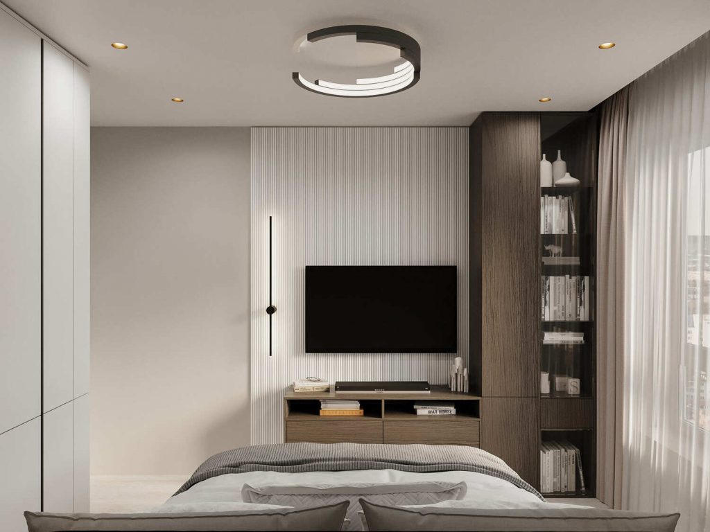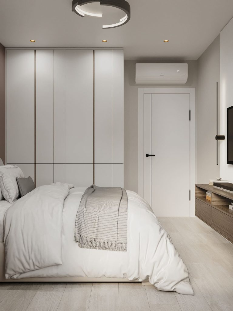 Окна в спальне обрамлены длинными тканевыми шторами, пропускающими мягкий свет, который наполняет пространство воздухом. Удобная зона для хранения, включая встроенный шкаф с чистыми линиями, обеспечит достаточное место для вещей, при этом оставаясь незаметным и гармоничным в интерьере.