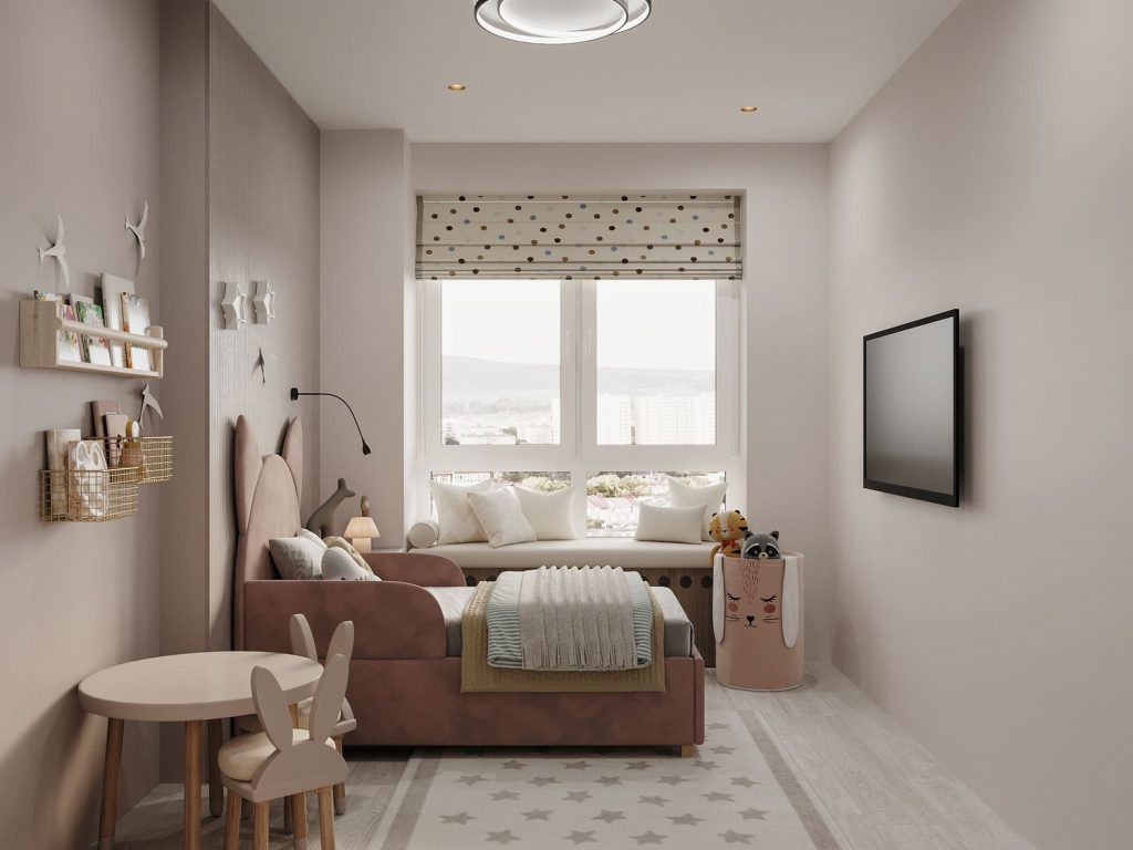 Дополняет интерьер столик с двумя стульчиками в виде зайчиков, где ребёнок может играть или рисовать. Просторный ковёр с рисунком в виде звёзд создает уединенное пространство для игр, при этом не загромождая комнату. Внешний вид комнаты также подчеркивает большое окно, из которого открывается вид, и уютный диванчик с подушками, где можно посидеть с книжкой или просто отдохнуть.