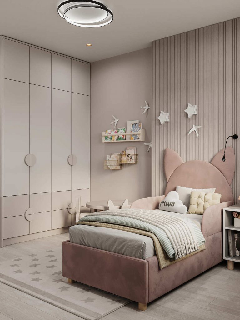 Детская комната в этом проекте создана с особым вниманием к функциональности и уюту, где каждая деталь продумана для комфорта малыша и его родителей. Стены в мягких розовых и бежевых оттенках создают атмосферу тепла и спокойствия. Акцент на текстурные элементы стеновых панелей и декоративные детали, такие как милые звездочки и фигурки птиц, придают комнате игривость и атмосферу сказки.