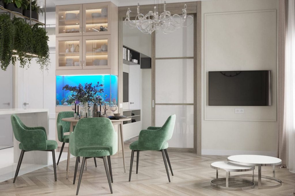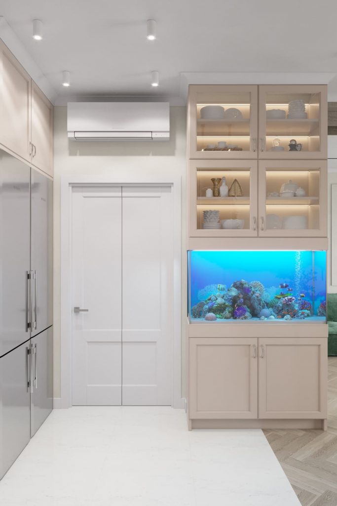 Главная «фишка» — встроенный аквариум с подсветкой, который создаёт эффект живой картины. Мы подвели к нему все необходимые коммуникации, чтобы уход за ним не требовал лишнего времени, а визуальный эффект всегда оставался на высоте.