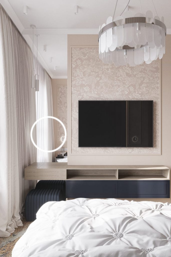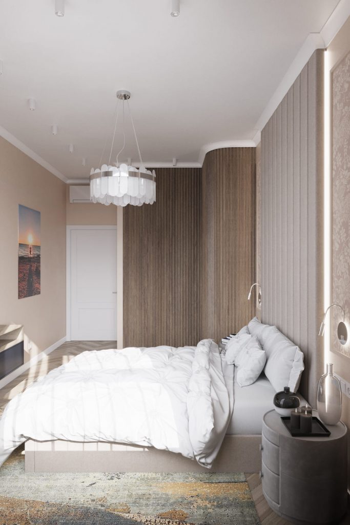 Цветовая палитра выстроена на нюансах бежевого, молочного и светлого дерева. А декоративные вставки с текстильными обоями добавляют глубины. Светильники, как и всё в этом проекте, не просто «красиво» — они продуманы для разных сценариев: чтение, отдых, вечерняя подсветка.
