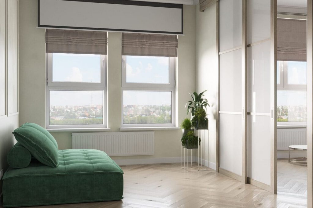 Эта зона — про спокойствие и перезагрузку. Мягкий зелёный шезлонг у окна настроен на расслабление, медленное утро с видом или вечер с книгой. Но за кажущейся простотой — технологичное сердце: из потолка опускается экран, а встроенный проектор и акустика превращают комнату в полноценный мини-кинотеатр. Раздвижные перегородки позволяют изолировать пространство, не перегружая интерьер. Цветовая гамма — светлая и воздушная, чтобы не спорить с панорамой за окном. А вертикальная композиция с живыми растениями оживляет угол и поддерживает общую «зелёную» идею интерьера.