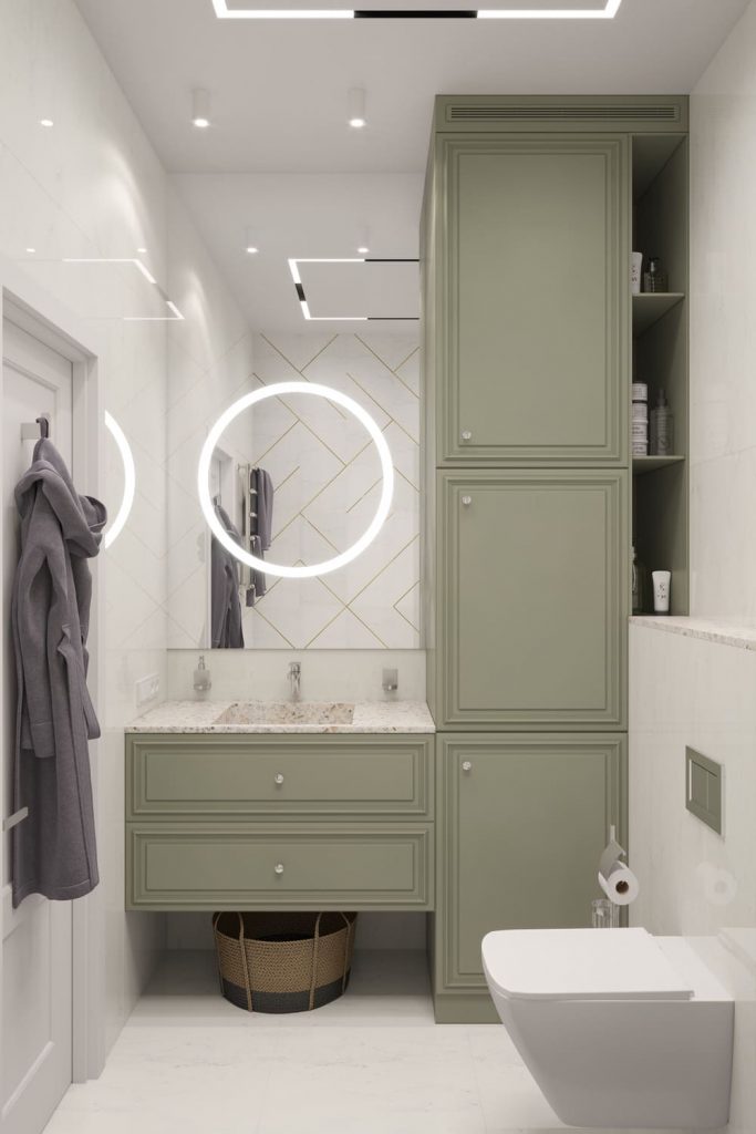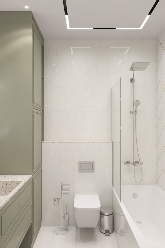 Чтобы визуально не загружать пространство, мы сделали шкаф в тон нежного зелёного, добавили тонкие фрезеровки и лаконичные ручки.