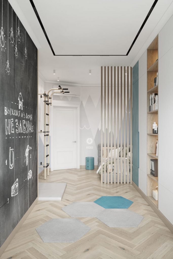 Главное деление пространства — на активную и спокойную зоны. В одной — скалодром, шведская стенка и даже меловая доска для творчества, заметок или расписания. В другой — уютная кровать, отгороженная деревянными ламелями, с мягкой посадкой и атмосферной подсветкой.