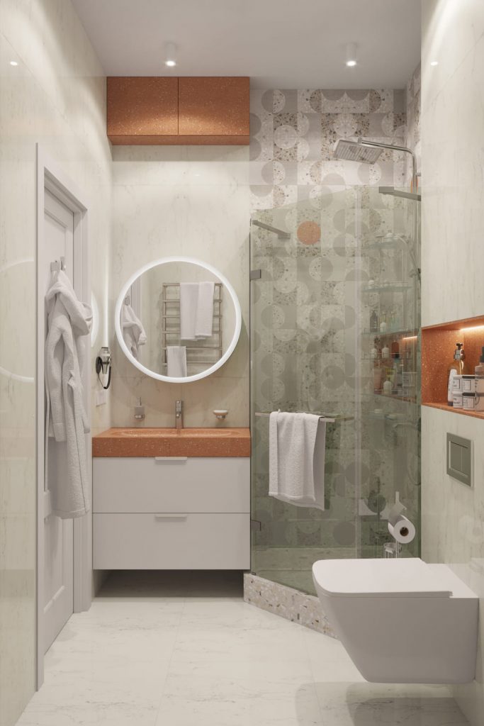 В этой ванной от терракотовой столешницы до геометрии керамогранита в зоне душа. Мы специально заложили в проект контраст к основной ванной — здесь всё должно задавать тон дню, а не убаюкивать. Терраццо, круглое зеркало с подсветкой, ниши с подсветкой и глянцевая фактура плитки — интерьер яркий, но не перегруженный. Всё, что нужно — под рукой: открытые полки, встроенные полки в душевой, вместительная тумба под раковиной. При этом компактное пространство работает на 100% — несмотря на скромные размеры, здесь поместились и душевая кабина, и полноценное хранение, и все удобства.