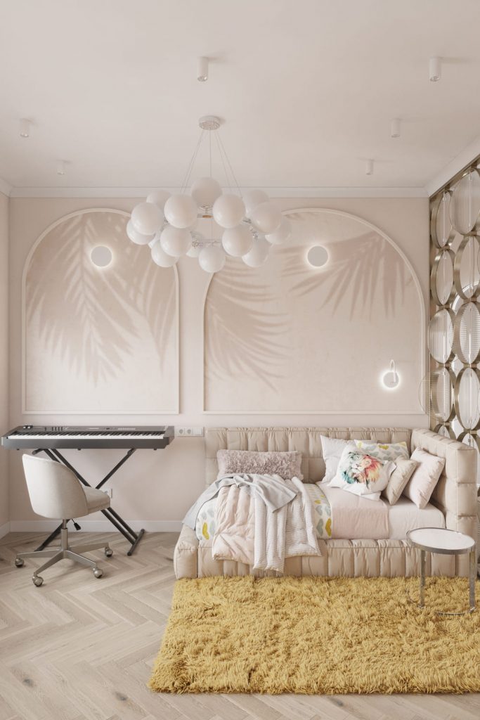 В комнате легко читается ритм и лёгкость — от геометрии светильников до игры теней от рельефных панно на стенах. Всё работает на то, чтобы ребёнку было интересно, удобно и красиво. А если вдруг захочется поиграть или поиграть на синтезаторе — место уже есть.