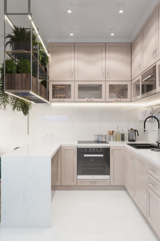 Рабочая зона кухни спроектирована по законам эргономики: всё на своих местах, всё под рукой — от крупной техники до мелочей. А стеклянные фасады шкафов с подсветкой подчёркивают эстетику и делают пространство визуально легче.