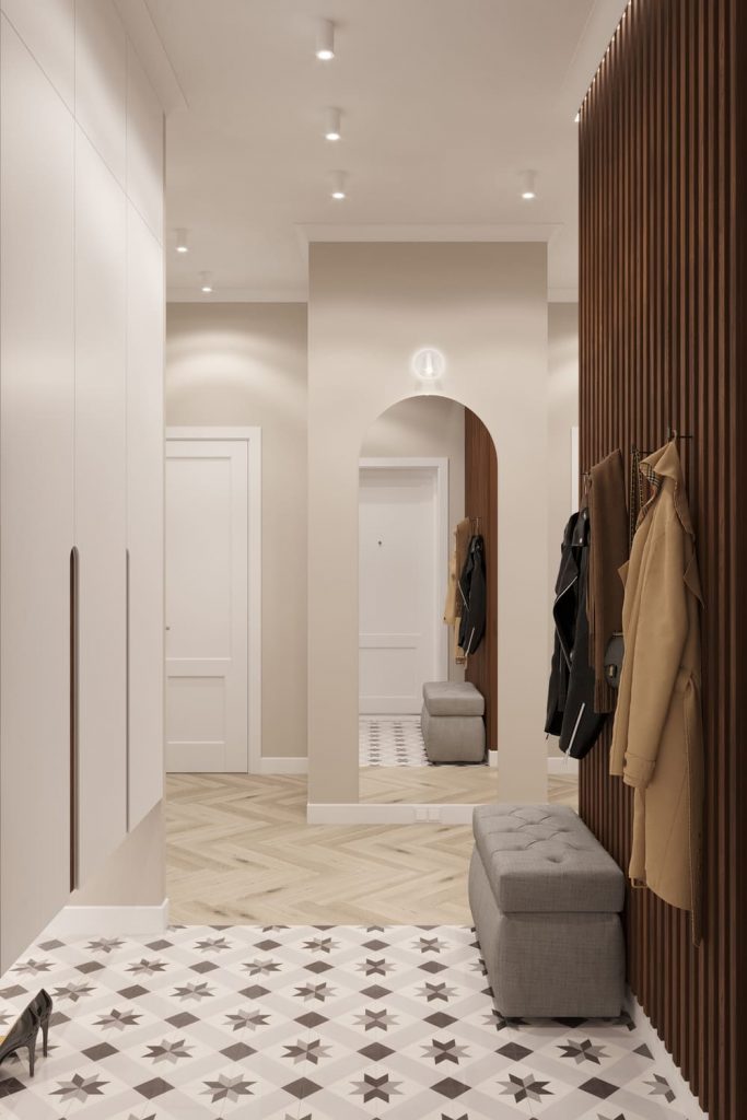Зеркало в арке и мягкая скамья создают уют и удобство, а деревянные рейки добавляют ритма и защищают стены. Всё рассчитано до мелочей: как зайти, где разуться, куда повесить пальто. Ни одного случайного элемента — всё «потому что».