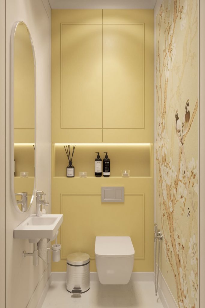 Этот санузел — как яркая открытка среди нейтральных интерьеров. Мы сознательно сделали его светлым, тёплым, с ноткой азиатской графики — вдохновлялись японскими гравюрами и весенними садами. Фреска с птицами над раковиной сразу задаёт настроение: лёгкость, деликатность и немного мечтательности. Цвет фасадов — мягкий лимонный, он визуально расширяет пространство и отлично сочетается с белыми стенами и светлым полом. Мини-раковина, подвесной унитаз, ниша с подсветкой — всё на своих местах, всё функционально.