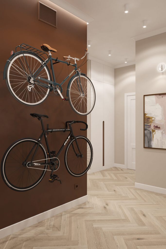 Тёплая терракотовая стена с велосипедами — не просто декор, а удобное решение для активной семьи. Мы заранее предусмотрели крепления, освещение и сделали эту зону акцентной — почти как арт-объект.