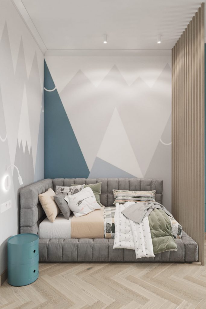 Эта комната создавалась для подростка, и здесь всё говорит о движении, энергии и личной территории. Стены с геометрией гор — не просто декор, а визуальная метафора роста, достижений и свободы.