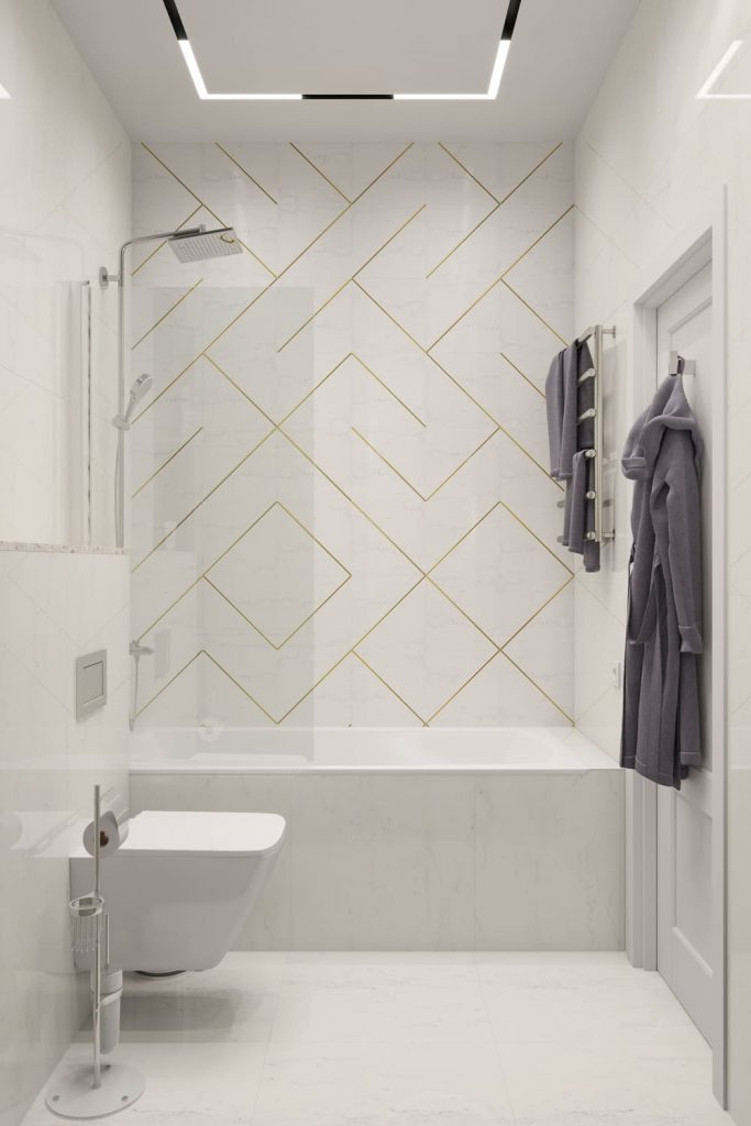 Стена над ванной оформлена керамогранитом с геометрией — этот золотистый акцент буквально собирает интерьер воедино и придаёт ему характер. Зеркало с подсветкой и световые линии на потолке создают современный ритм, не нарушая общее ощущение чистоты и покоя.
