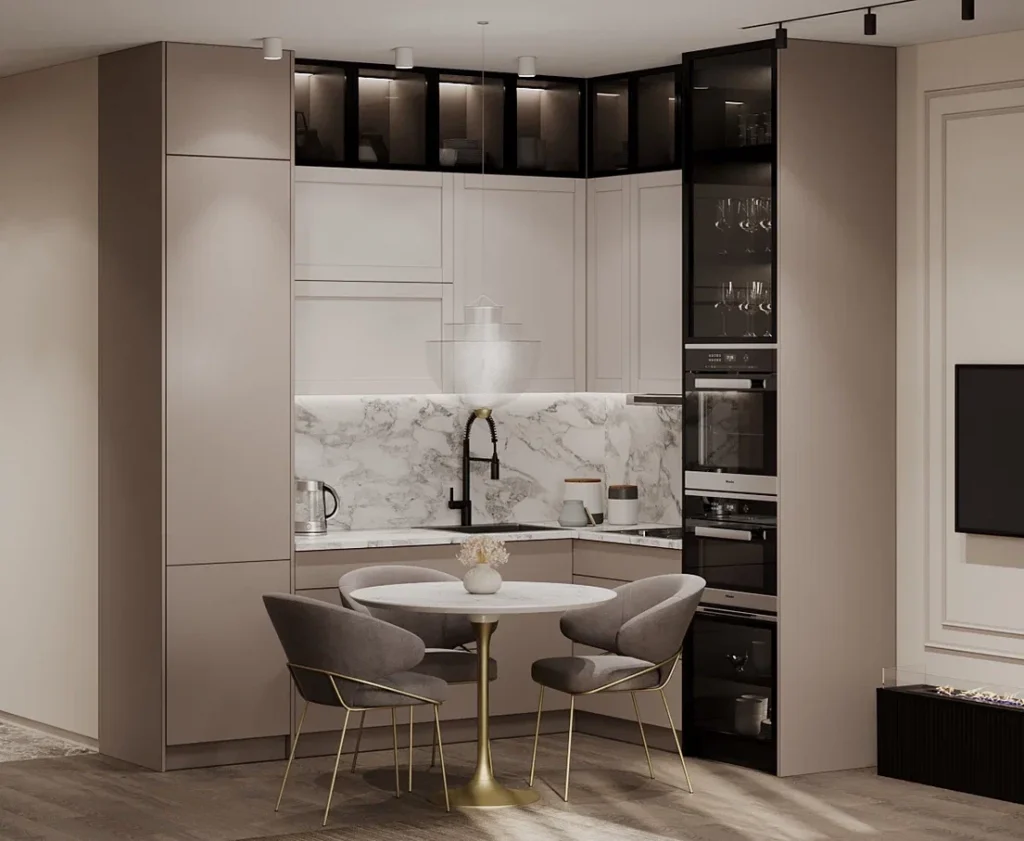 Тон кухонной мебели был максимально подобран под цвет стен, за счет чего гарнитур идеально вписался в интерьер. Часть фасадов со стеклом в обрамлении черных рамок и с подсветкой четко зонируют пространство кухни и обеденной зоны от гостиной. Обеденный стол круглый с подвесным локальным светильником, который помогает обособить обеденную группу по середине комнаты. В гостиной зоне расположились небольшая модульная софа и журнальный столик, а на стене напротив телевизор. Круглые формы столов и светильников гармонируют друг с другом в интерьере.