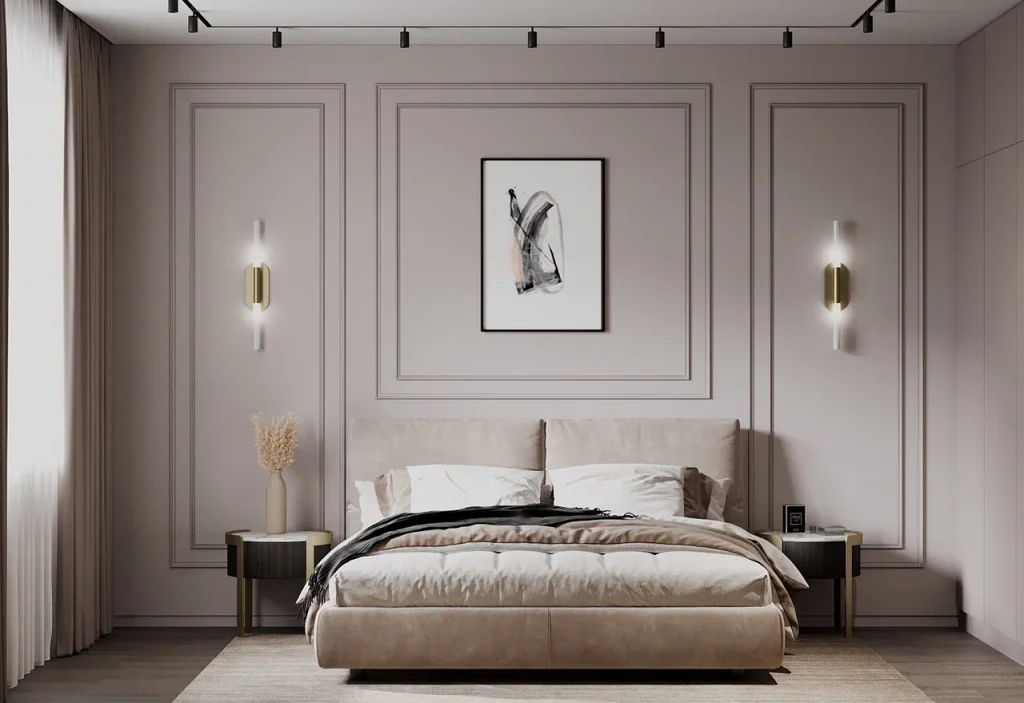 Интерьер выполнен в кофейно-бежевой гамме с черными акцентами в светильниках и фурнитуре, что считается сегодня трендовым сочетанием цветов. Материалы и фактуры подобраны приближенные к натуральным природным и спокойным – это керамогранит с текстурой натурального среза мрамора и гранита. Молдинги на стенах добавляют данному интерьеру декоративности, выделяют некоторые зоны и обращают внимание на предметы искусства, присутствующие в интерьере. В каждом помещении продуманы несколько сценариев освещения за счет разных типов светильников и подсветки, а подвесные светильники и бра также имеют и декоративную функцию за счет продуманного стильного дизайна. Межкомнатные двери скрытого монтажа под покраску, скрытый плинтус отлично их дополняет.
