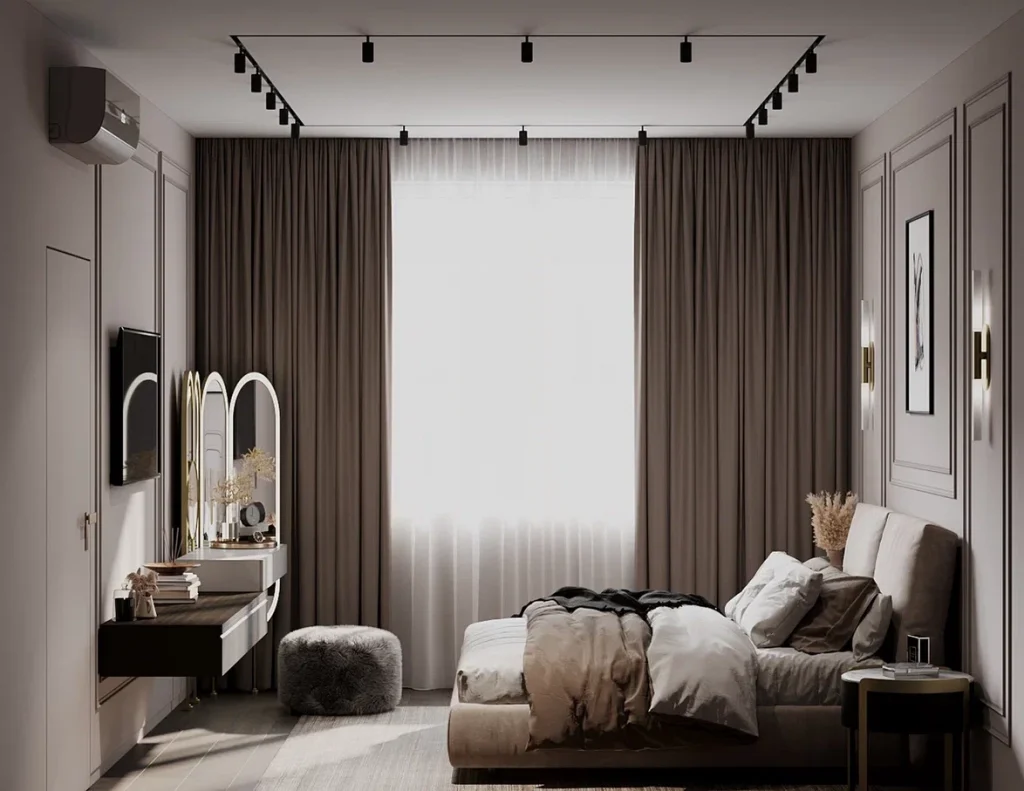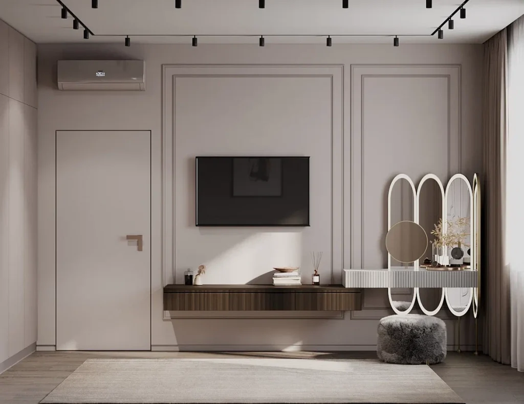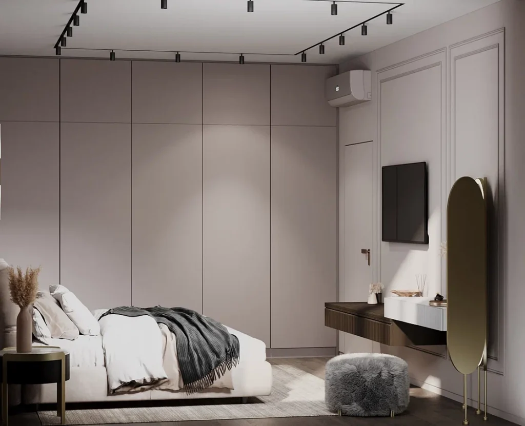 В спальне тоже подобрана кофейная цветовая гамма, но с более холодным оттенком. Вдоль стены справа при входе все пространство полностью занял встроенный шкаф. Двухспальная кровать в мягкой обивке разместилась в центре комнаты, а напротив зона TV, совмещенная с будуарным столиком. Здесь самая декоративная часть помещения – овальные зеркала с подсветкой – как выдающаяся часть этой подвесной консоли.