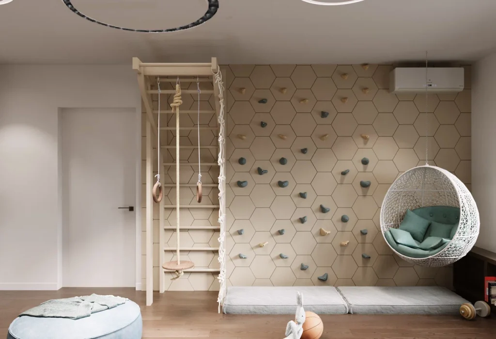 Особая гордость комнаты — спортивный комплекс с шведской стенкой, верёвками, кольцами и даже мини-скалодромом. Всё это превращает комнату в настоящую зону активностей прямо дома. Мягкий мат на полу делает игры безопасными.