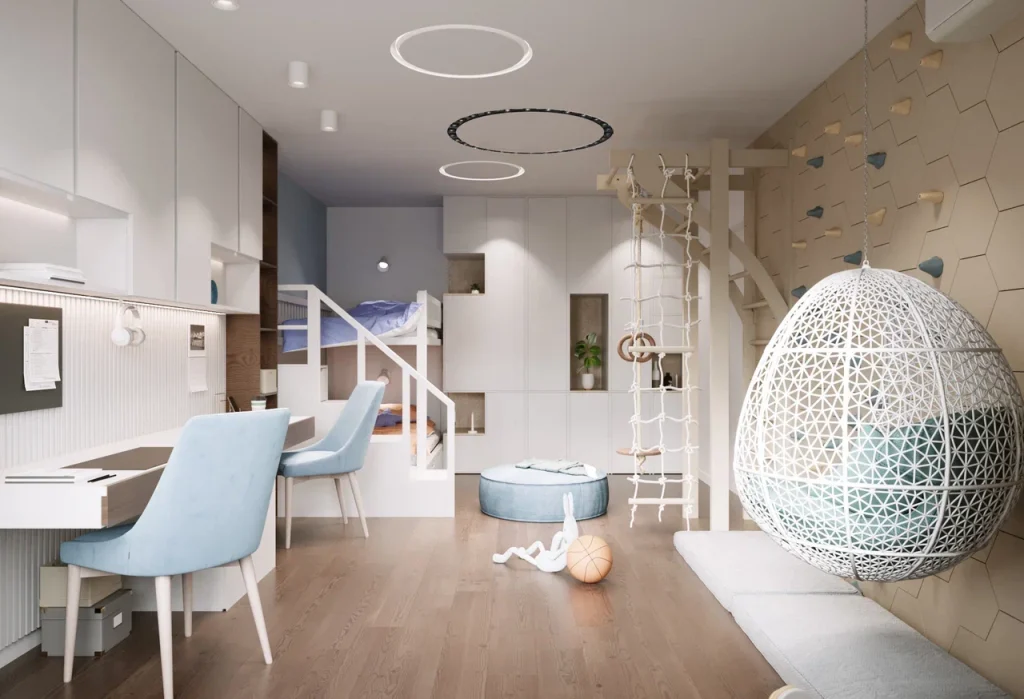 Это пространство — не просто комната, а настоящий мини-мир для двух энергичных мальчишек, где есть место и для учёбы, и для игр, и для отдыха. Интерьер создавался с акцентом на свободу движения, творчество и организацию личного пространства каждого ребёнка.