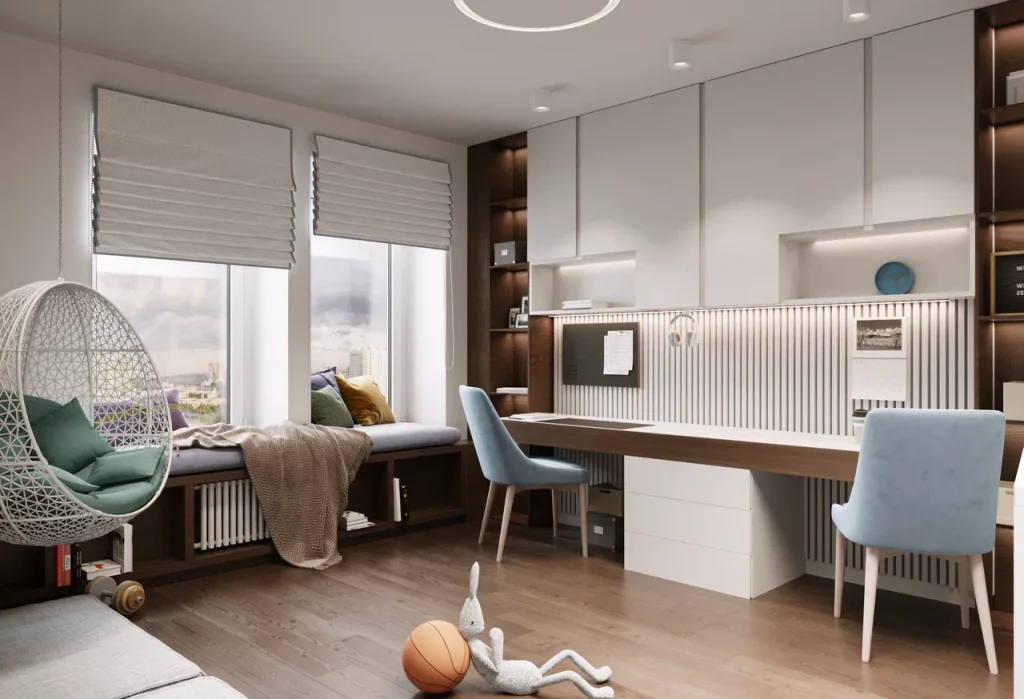 Рабочая зона организована с заботой о комфорте и порядке: большой общий стол на двоих, встроенное освещение, вертикальные панели для заметок и чёткая система хранения. Всё под рукой, но ничто не отвлекает. Мягкие кресла нежно-голубого цвета делают зону учёбы не только практичной, но и уютной.