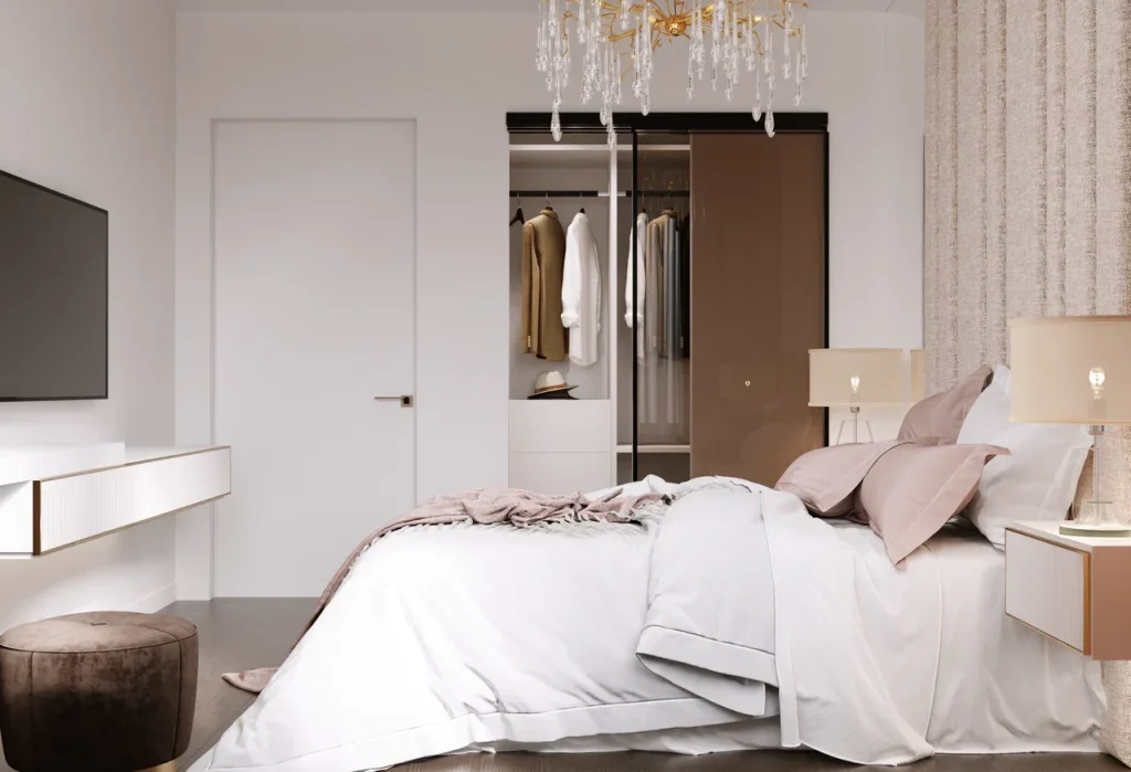 Особое внимание — гардеробной зоне. Вместительная система хранения с зеркальными дверями не только организует вещи, но и визуально увеличивает пространство, отражая свет и интерьер комнаты.