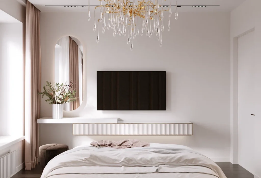 По обе стороны от кровати — подвесные тумбы с рельефными фасадами и прозрачные лампы на стеклянной ножке. А хрустальная люстра с золотистой основой добавляет лёгкий налёт роскоши и делает эту комнату по-настоящему «взрослой».
