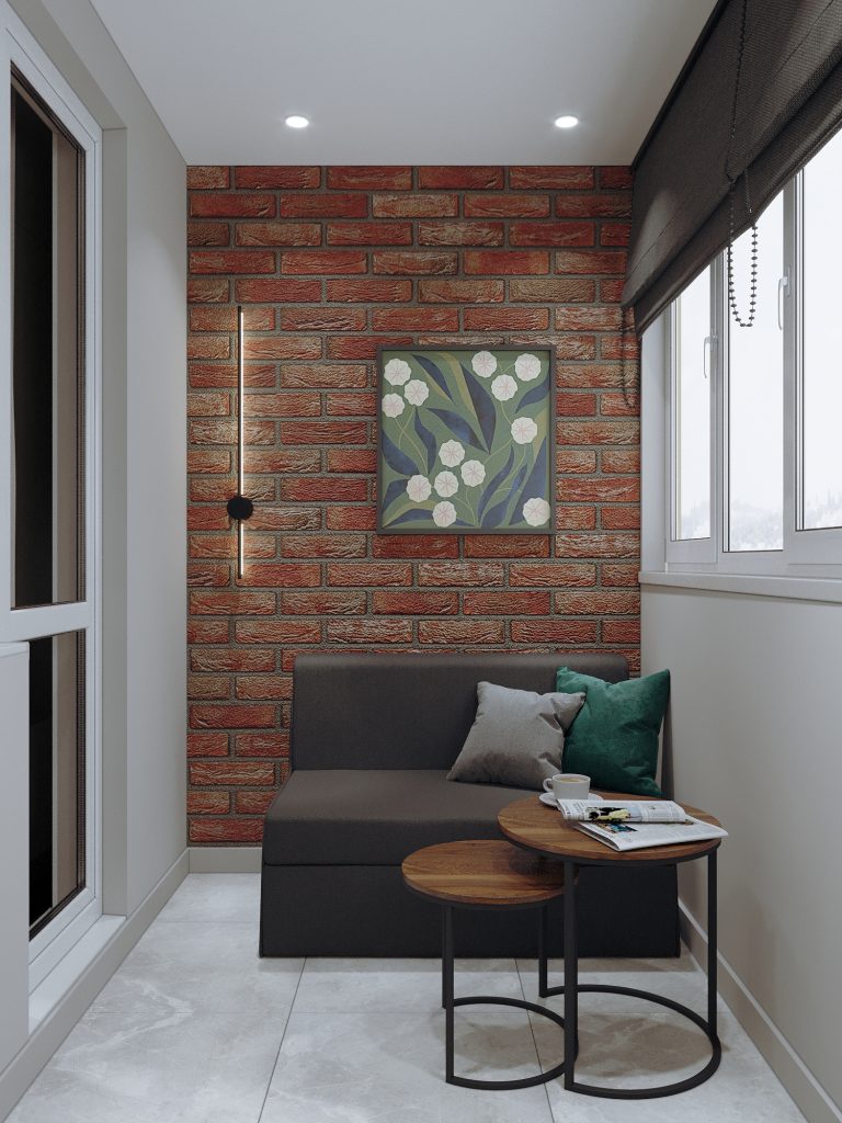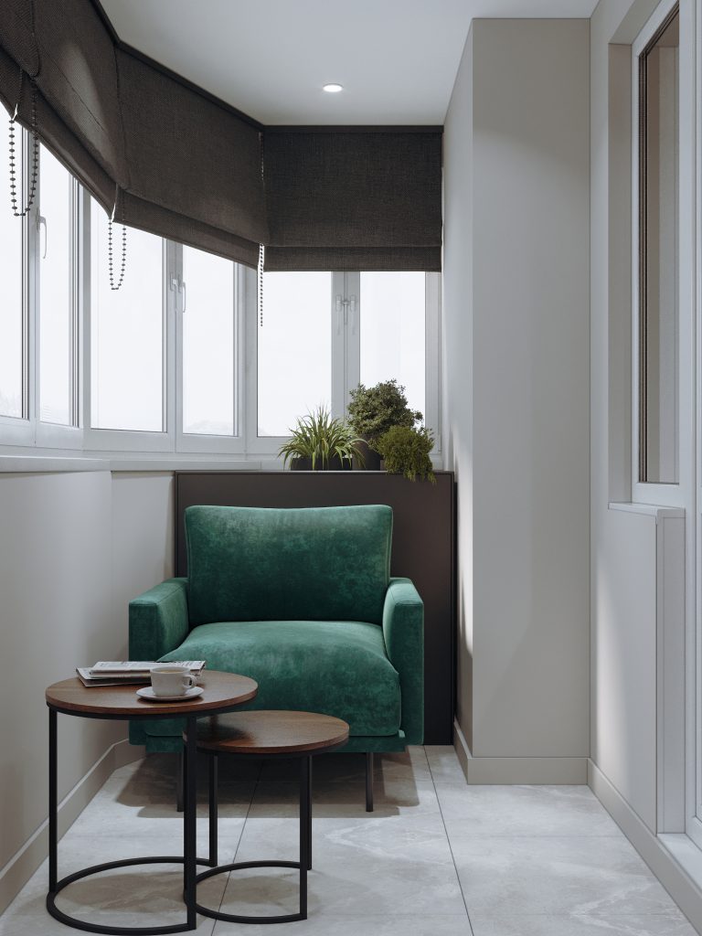 На балконе мы совместили две функции: хранение и зону отдыха. Здесь также продолжили природные мотивы в оттенках текстиля и картине. Предусмотрели мягкие комфортные кресла и небольшой журнальный столик - для неспешного вечернего отдыха с любимой книгой и чашкой кофе.
