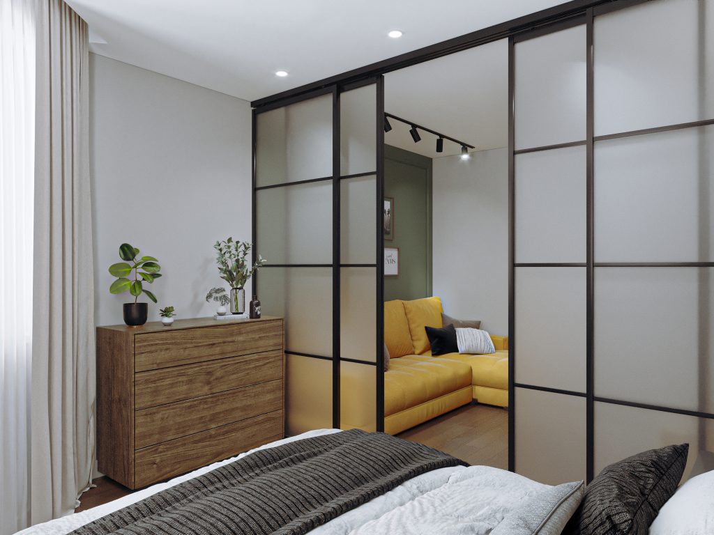 Одно большое пространство, оказавшееся в нашем распоряжении из исходных данных, было нефункциональным. Казалось нелогичным отказываться от спальни в пользу гостиной, и наоборот. Поэтому мы решили оставить обе важные комнаты - в одной, разделив зоны перегородкой из матового стекла. Так, если даже дверцы закрыты, в часть гостиной все равно будет попадать солнечный свет. Такой же яркий и жизнерадостный, как цвет выбранного для проекта желтого дивана, разместившегося на фоне травянисто-зеленой стены.