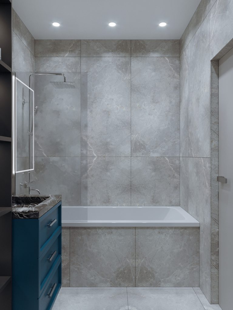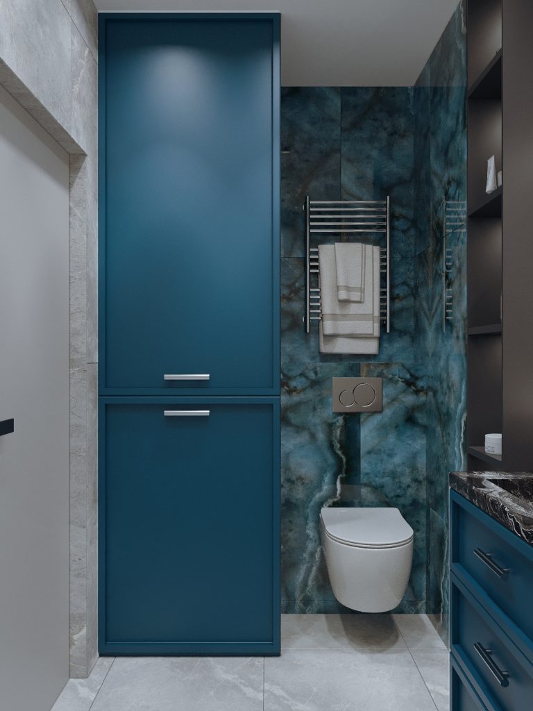 Насыщенные синие оттенки в санузле и текстура керамогранита напоминают течение горной реки, поддерживая концепцию природности и естественности. По желанию заказчиков мы разместили в помещении разные виды хранения: от закрытых модулей сушильной и стиральной машины или тумбы под раковиной до открытых полок с подсветкой. Один из интересных элементов дизайна - раковина в столешнице, выполненная в темном камне. Кроме того, это очень функционально, учитывая, что на ней не видны разводы.