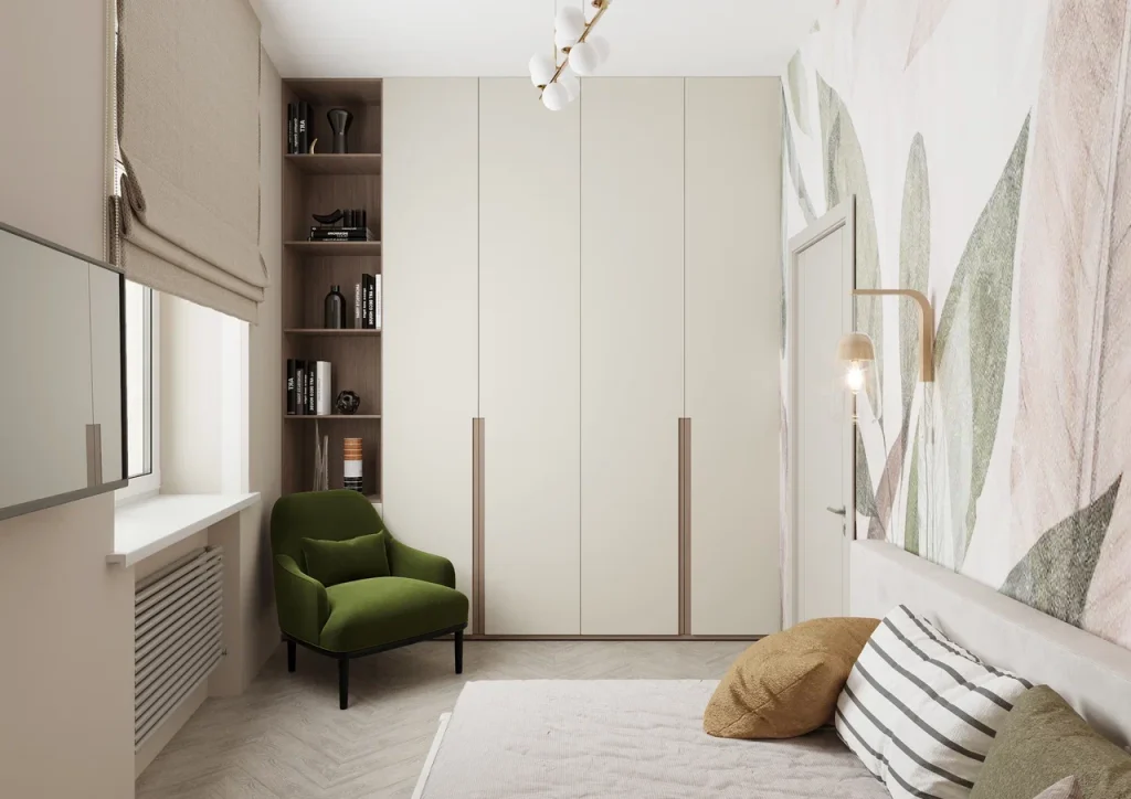 Спальня бабушки - самое нежное пространство квартиры. Пастельные оттенки 3D-панелей, мягкость текстуры дерева, природных фотообоев. Даже бра - будто капли росы на листьях рисунка. Их немного разбавляет акцент из тепло-зеленого кресла и открытых полок стеллажа, выполненных в темном дереве. На этих полках бабушка сможет разметить любимые книги, а потом читать, сидя на мягком кресле. Помимо прочего, здесь мы предусмотрели прикроватную тумбу для того, что всегда должно быть под рукой.