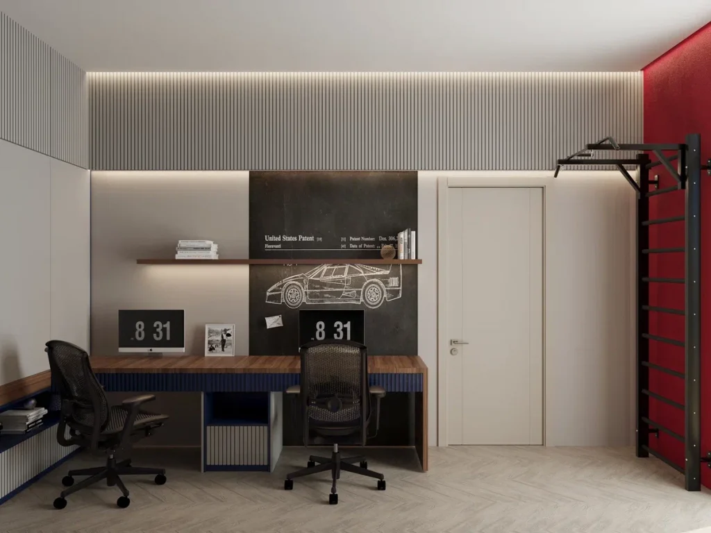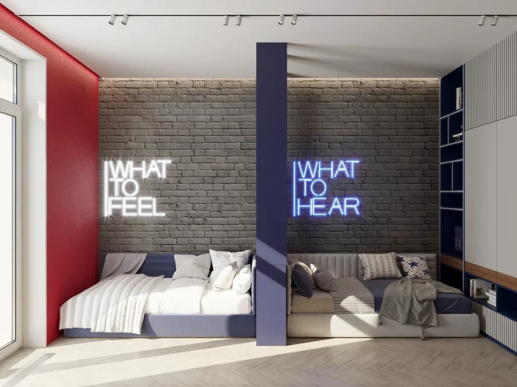 Детская комната в проекте выбивается из общего «эко-ряда». Но решение не спонтанное, а пожелание детей заказчиков. Да и, согласитесь, для подрастающих мальчиков природные оттенки - не лучшее решение. Поэтому мы использовали яркие цвета, неоновые светильники, кирпичную стену с подсветкой, в духе стиля лофт. Не обошлось без просторных рабочих мест, за которыми комфортно и делать уроки, и играть в компьютер. К слову, дополнены они меловой стеной: наверняка, не для сухих заметок, а для свободы творческого воображения. Мы сделали перегородку-стеллаж между спальными местами. Также для хранения предусмотрели шкафы до потолка для одежды, книг, игрушек. А на открытых полках может разместиться оригинальная коллекция фигурок, которую обязательно должен видеть каждый гость комнаты.