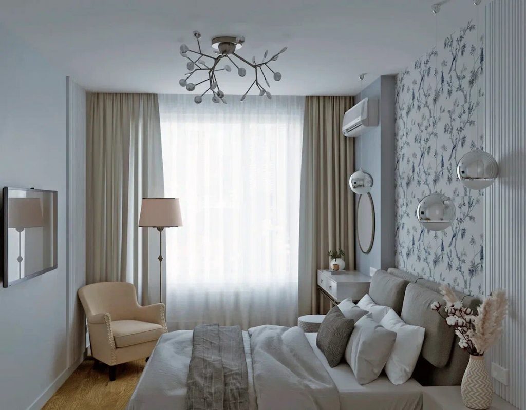 В оформление спальни по пожеланию заказчиков добавлена нота прованса в виде обоев в нише за кроватью, а также консоли-туалетного столика и прикроватной тумбы. Функционально спальня включает зону отдыха с большой кроватью, с левой стороны от нее - туалетный столик-консоль с круглым зеркалом над ним и с компактным пуфом-цилиндром. А с правой стороны - компактная тумба-комод с выдвижными секциями, напротив кровати расположена навесная ТВ панель без тумбы, чтобы не занимать проход в небольшой комнате. Также, в спальне есть небольшая зона для чтения в виде удобного кресла. Зона хранения представлена большим гардеробным шкафом.