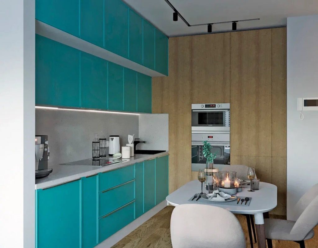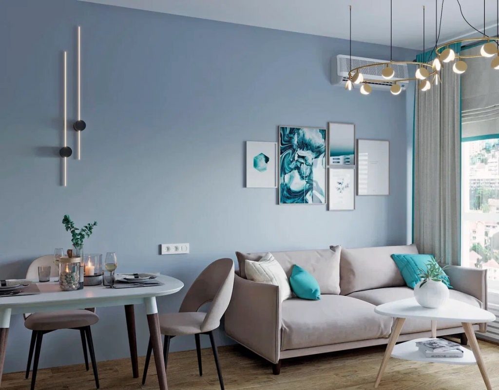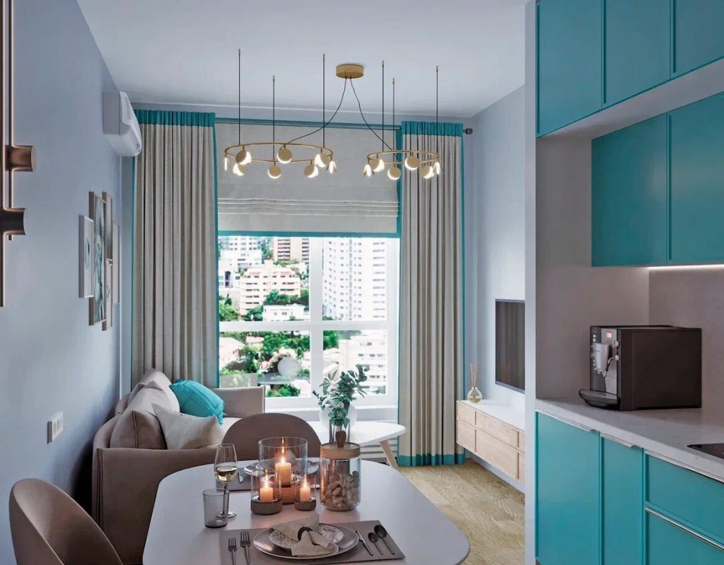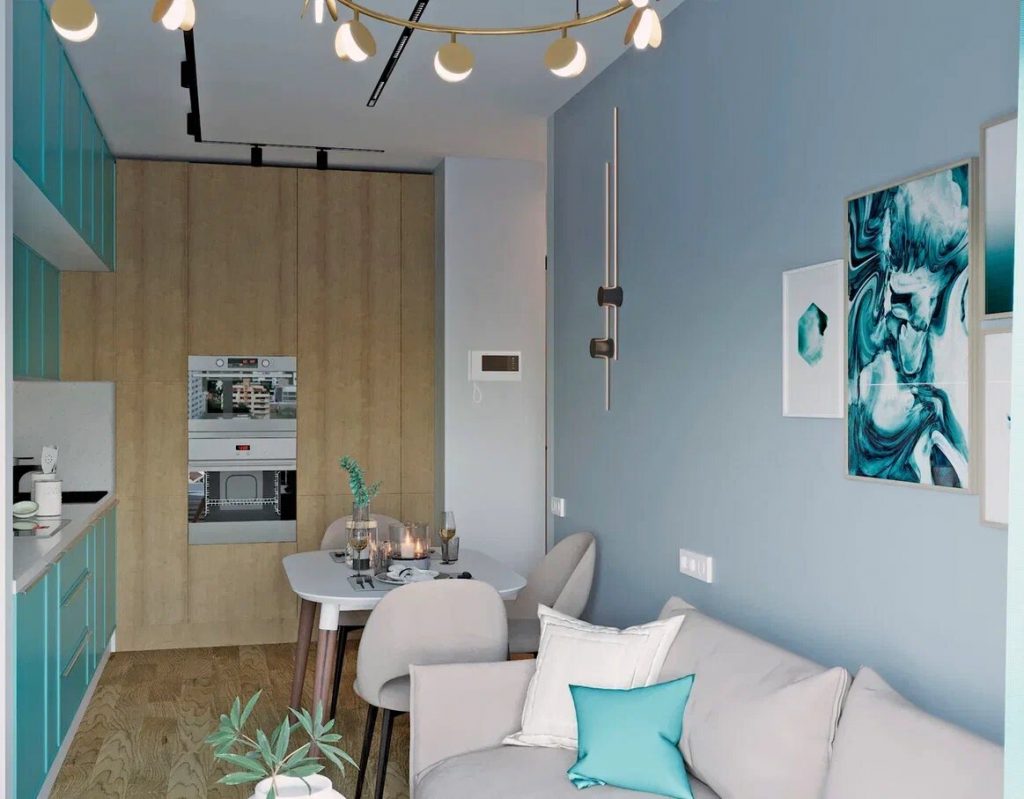 Квартира в современном стиле в голубых тонах с бирюзовыми акцентами