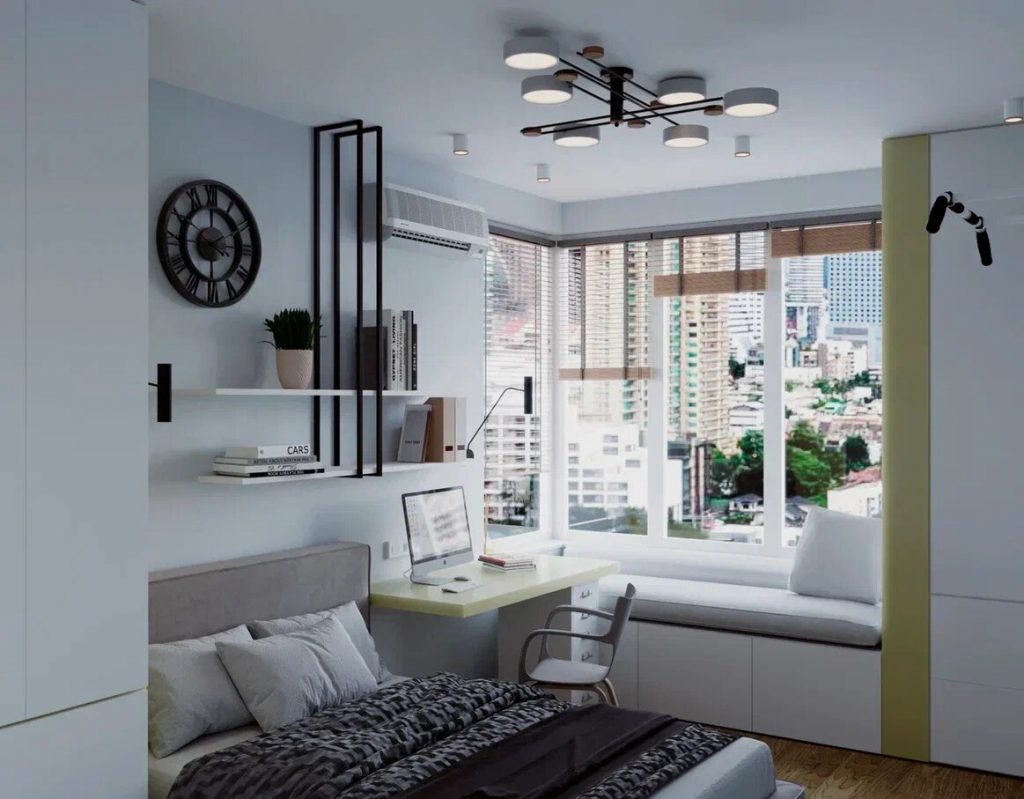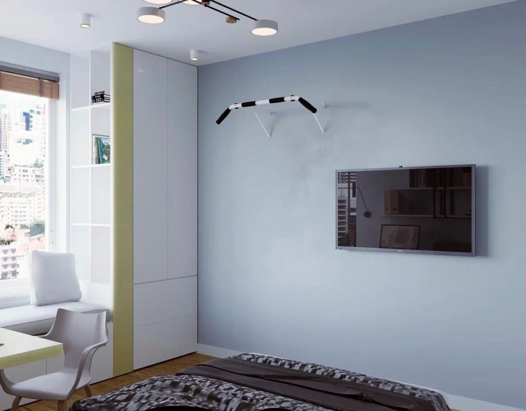 Небольшая детская комната также функциональна, эргономична и индивидуальна. В ней нет ничего лишнего и просчитан каждый сантиметр. В ней только - зона отдыха, в которой лишь кровать и ТВ панель. Напротив - небольшая рабочая зона, включающая компактный компьютерный стол с выдвижными секциями с правой стороны. Над компьютерным столом - небольшой открытый стеллаж в оригинальном стиле. В зоне мягкого подоконника тоже имеется встроенный стеллаж для книг. Зона хранения представлена небольшим шкафом возле двери. Яркий, но в тоже время функциональный элемент оформления - большие металлические черные часы над кроватью - так везде можно успеть. Еще, нами предусмотрена в детской небольшая спортивная зона в виде подвесного турника для подтягивания (возле ТВ панели)