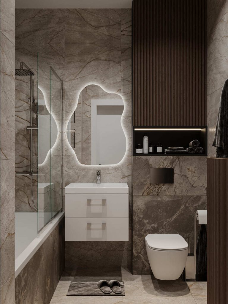 Ключевой элемент — зеркало с неоновым контуром, которое не только выполняет функцию освещения, но и добавляет эстетическую ценность пространству. Санузел разделен на несколько функциональных зон, включая ванну с прозрачной перегородкой, которая сохраняет ощущение пространства, не скрывая его.