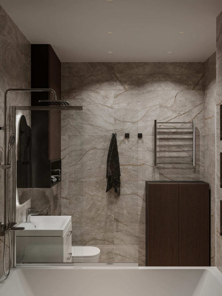 Стены в санузле покрыты элегантной мраморной плиткой с легкими золотистыми прожилками, создавая ощущение роскоши, но не перегружая пространство. Современные формы и внимание к деталям становятся ключевыми в этом интерьере.