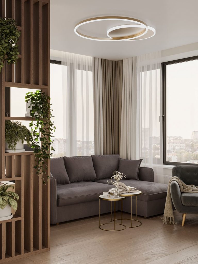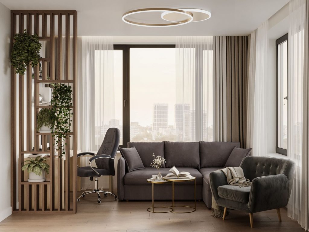 Особое внимание привлекает разделительная конструкция из дерева с растениями, которая служит не только функциональной перегородкой, но и добавляет живости интерьеру. Она помогает зонировать пространство, создавая ощущение уединённого рабочего уголка, в то время как остальная часть комнаты остаётся открытой.
