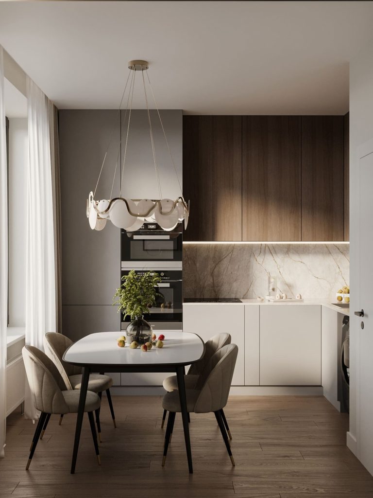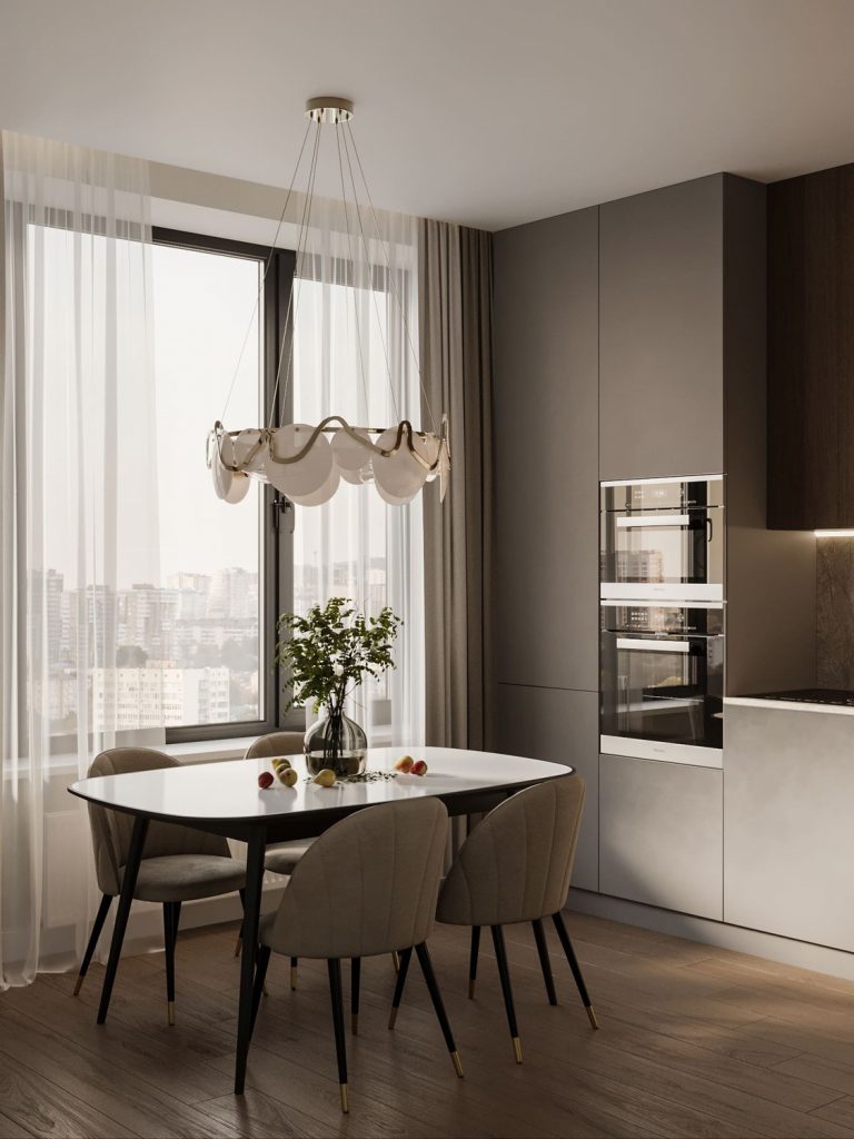 На кухне дизайн продолжает чередование монохромных оттенков, создавая элегантное и современное пространство. Просторное окно наполняет комнату светом, создавая уютную атмосферу для завтраков и ужинов. В центре внимания — стильная люстра с уникальным дизайном, ее форма, напоминающая органичные изгибы, придает комнате динамичность и привлекает взгляд.