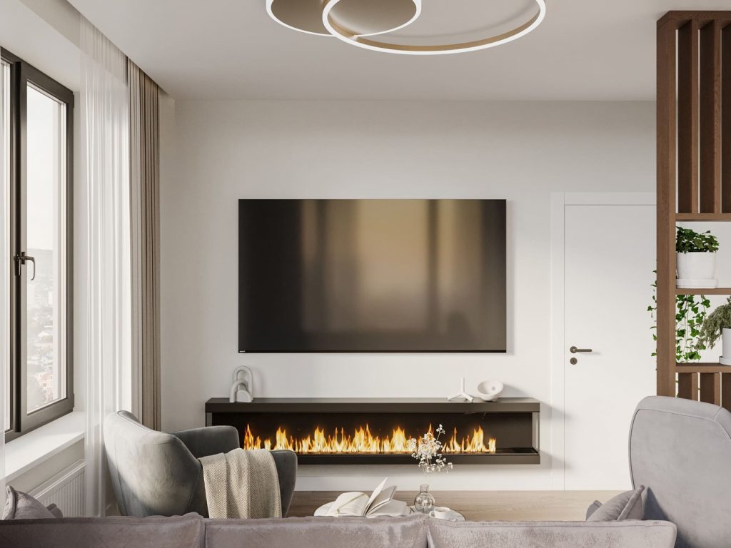 Мебель в гостиной выбрана с акцентом на комфорт и стиль: тёмно-серый диван и кресло с изысканным дизайном идеально сочетаются с золотыми акцентами на кофейных столиках. В этой комнате уютно проводить время с близкими, наслаждаясь современными технологиями, как, например, телевизор с функцией электрокамина, который создаёт дополнительную атмосферу тепла и уюта.