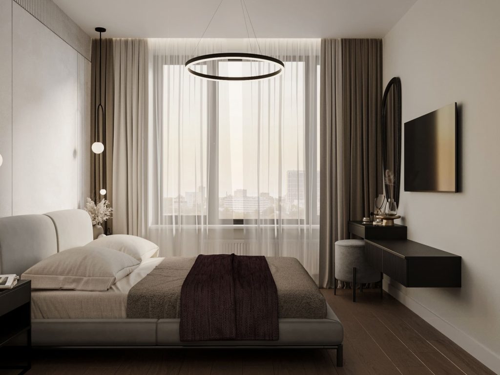 Комната продумана до мелочей: от изысканных светильников до функциональной мебели. Черные прикроватные тумбы с простыми, но элегантными ручками идеально сочетаются с легким креслом и стильной консолью, поддерживающей минимализм. Большие окна с легкими шторами наполняют спальню естественным светом, добавляя ощущение простора.