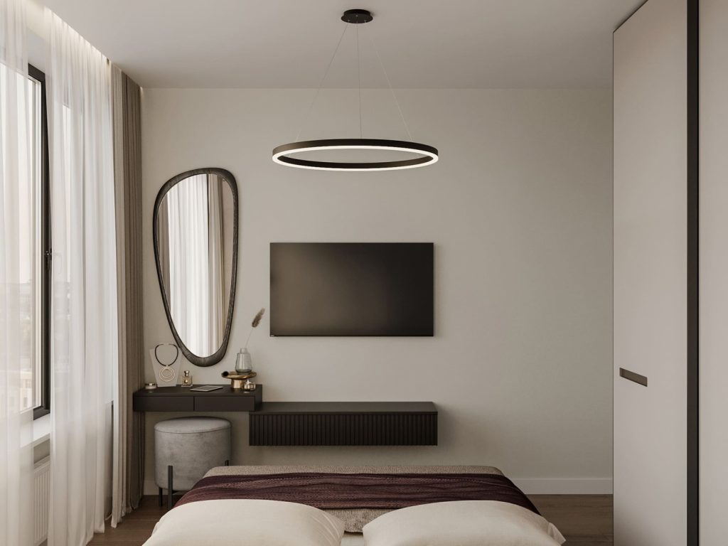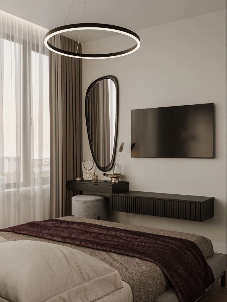 В центре внимания — уникальная подвесная люстра в виде кольца, добавляющая современности и динамики в пространство. Ее простая, но выразительная форма привлекает внимание, подчеркивая современный стиль спальни.