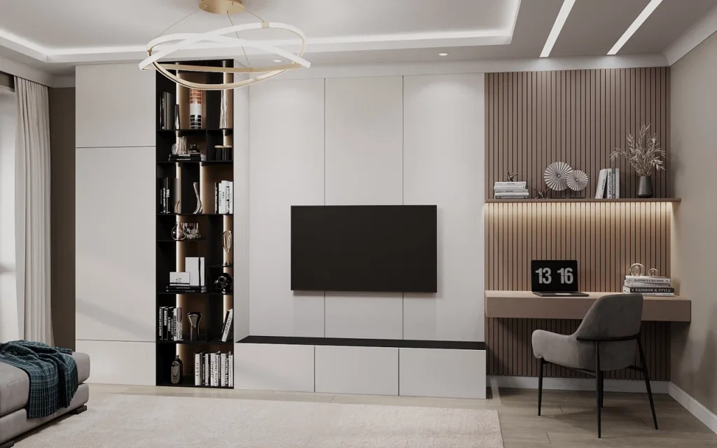 Зона отдыха является одновременно и спальным местом детей, ввиду этого, кроме большого углового дивана тут имеется и раскладывающееся кресло-кровать. Еще, это зона содержит подвесную ТВ панель с компактной тумбой с тремя секциями. Рабочее место включает подвесной вместительный компьютерный стол, над которым предусмотрена подвесная же функциональная полка для учебников, тетрадей, канцелярских принадлежностей и прочего, и удобное мягкое кресло. Также, в гостиной имеется зона хранения в виде одной секции с закрытыми дверями, а другой - с открытыми полками.