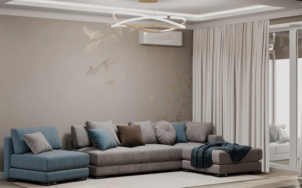 Хорошо продумано освещение в гостиной - так, над рабочим местом это - подсветка от подвесной полки, зона ТВ панели освещается точечными светильниками подвесного потолка, а общее: обеспечивается днем - окном, а вечером - большой дизайнерской люстрой и потолочной подсветкой. Эксклюзивность гостиной придают авторские тисненные обои с изображением стаи птиц.