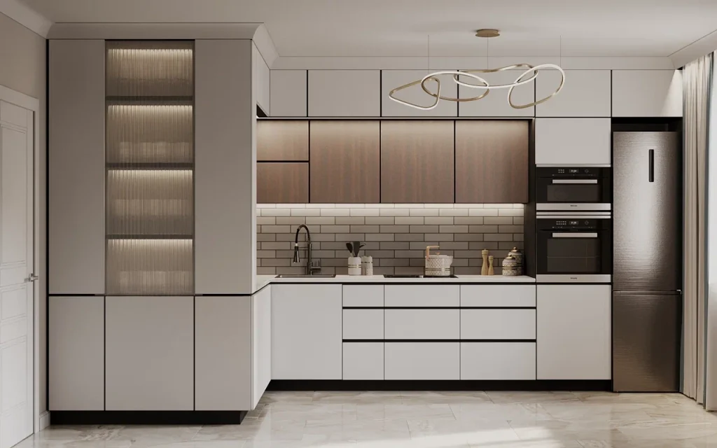 Кухня объединяет в себе зоны столовой и, собственно, кухни. По пожеланию заказчиков угловой кухонный гарнитур - максимально вместительный и функциональный. Он включает в себя встроенные: холодильник, духовой шкаф с СВЧ, мойку, плиту и модули с разделочными столами. Все верхние секции кухни, как и нижние - закрытые, а также имеется боковой модуль с полками за рифленым стеклом. Зона столовой включает лаконичный, обтекаемой формы, большой стол с удобными мягкими креслами-стульями; над ним размещена ТВ панель.