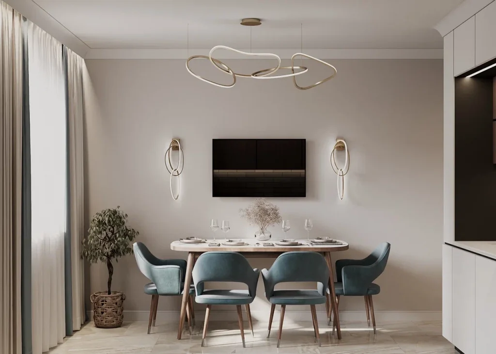 Тщательно продумано нами освещение кухни с учетом функциональности зон. Так, общее дневное обеспечивает большое окно, а вечернее - большая дизайнерская потолочная люстра. Рабочая поверхность кухни освещается мягкой подсветкой верхних модулей; полочки в застекленном модуле также подсвечены, что красиво подчеркивает праздничную посуду; зона столовой выделена с боковых сторон ТВ панели настенными бра в одном стиле с люстрой.