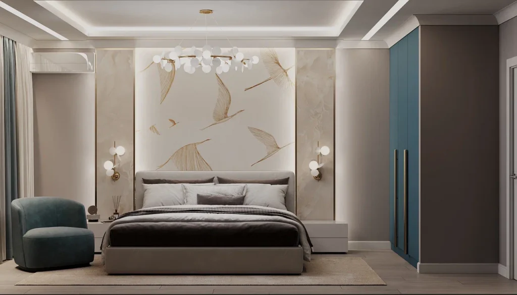 Нами продуман самый оптимальный вариант освещения спальни: дневное - через окно, вечернее - основное - от дизайнерской люстры и потолочной подсветки, а специальное - от бра в одном стиле с люстрой над прикроватными тумбами. Особую эксклюзивность спальне придают авторские тисненые обои с изображением стаи журавлей (в нише за кроватью).