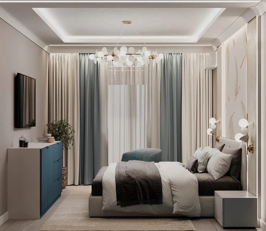 Небольшая спальня родителей так же максимально функциональна, эстетична и удобна, как и хотели заказчики. Она включает 2 зоны - отдыха и хранения. Первая представлена: большой двуспальной удобной кроватью, по бокам от которой находятся минималистичные прикроватные тумбы с двумя закрытыми секциями; и расположенной напротив подвесной ТВ панелью. Зона хранения включает комод под ТВ панелью, имеющий отделения с выдвижными ящиками и дверцами, а также большой шкаф.